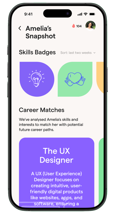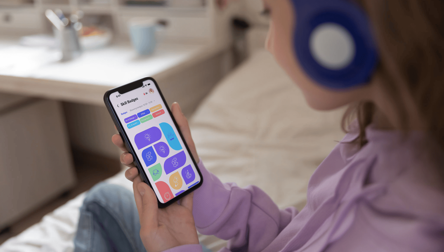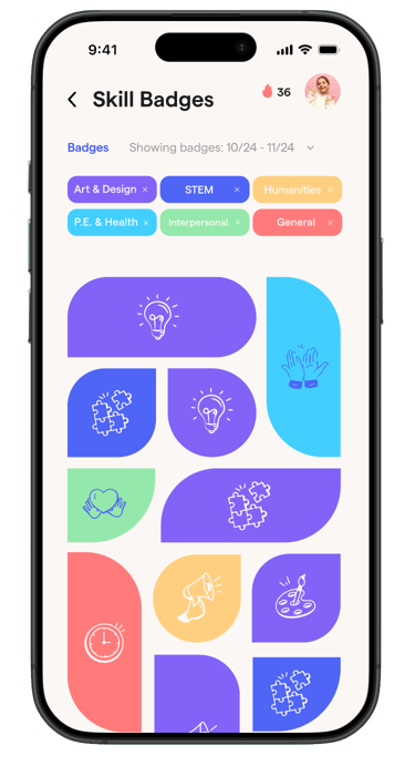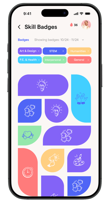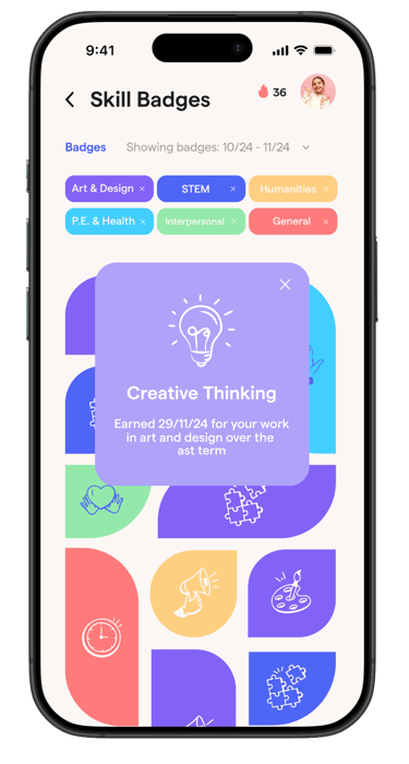 The student app has a skill badge feature; this is a hub where the student can learn what skills they have gained at school. Presenting the badges as skills rather than subjects reinforces the notion that all subjects can use creative thinking, for example, removing the stereotype that creativity isn't a useful trait.