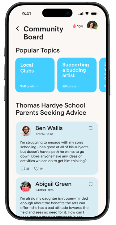 The community board allows parents to ask other users for anecdotal advice regarding any issues their child is having, for instance sourcing supplies for activities, local clubs and supporting children as they navigate choosing a career path.