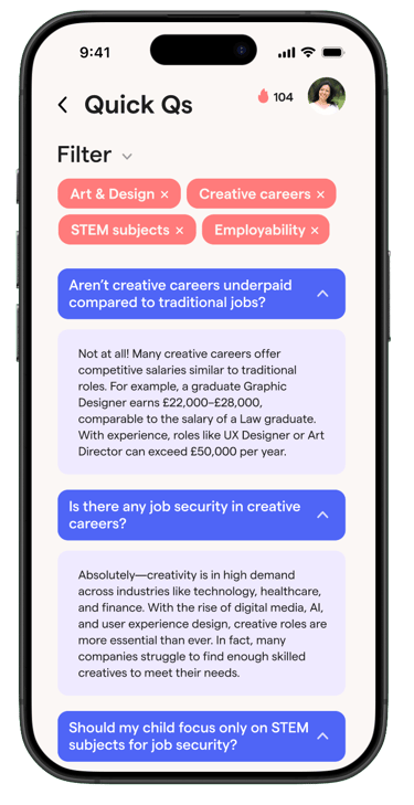Additionally, the app features a Quick Qs tab, which dispels any myths and answers any FAQs that are commonly associated with certain subjects. This can be filtered by subject and other factors (employability, career field, entry requirements).