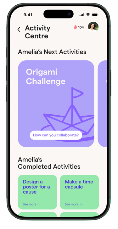 The parent app, like the student version, allows the user to view activity suggestions for the child to do (with or without their parent) to continue to nurture their interests outside of school.
